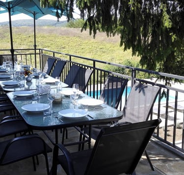 Op een van de terrassen kunt u in alle rust genieten van een heerlijke maaltijd, terwijl u uitkijkt over het betoverende landschap. De andere terrassen nodigen uit om te ontspannen, een boek te lezen of simpelweg te genieten van de zon en de serene sfeer rondom het huis.